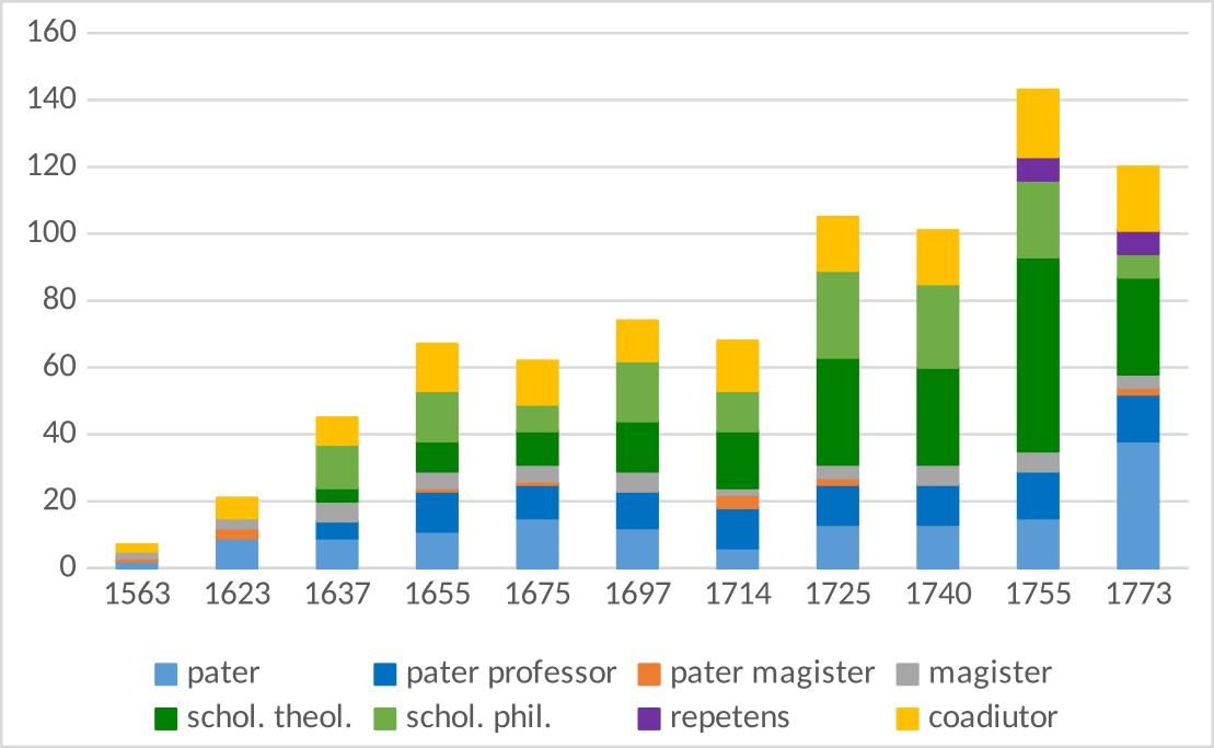 Nach der Universitätsgründung durch Erzbischof Pázmány stieg die Zahl der Jesuiten auf 60–90 Mitglieder, abgesehen von einigen Kriegszeiten (1640, 1680–1690 und 1710). Nach 1720 zog die Mitgliederzahl auf über 100 an, was vor allem auf die Zunahme der an der Universität studierenden Jesuitenscholastiker und daneben auf die (ab 1755 kontinuierlich organisierten) Repetentenkurse zurückzuführen ist, in den regelmäßig 10–16 Jesuiten teilnahmen. Die Gesamtzahl des Personals ging erst zurück, als die Universität 1770 unter staatlichen Kontrolle gestellt wurde, aber selbst zum Zeitpunkt der päpstlichen Aufhebung der Gesellschaft Jesu (1773) lebten noch 120 Jesuiten in Tyrnau.