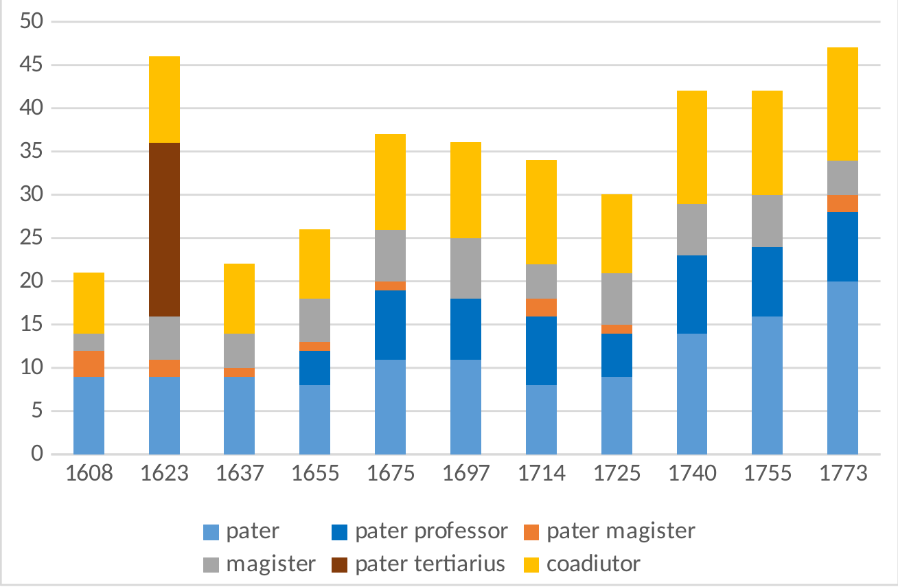 Die Bewohnerzahl schwankte. 1616 lebten dort 60 Studenten (davon 21 Adelige). Im Jahr 1621 setzten die Jesuiten das Seminar aufgrund des böhmischen Aufstandes (Kriegsgefahr) aus; nur 12 Musiker waren vorübergehend im Jesuitenkolleg untergebracht. 1648 waren 33 Studenten (davon 18 Alumnen, d. h. Stiftlinge), 1665 14 Stiftlinge (Musiker) und 12 Konviktschüler (Studenten/Schüler) im Konvikt. Danach lebten dort jedes Jahr 44–54 Zöglinge, 1768 34 Alumnen und 13 Konviktoren.