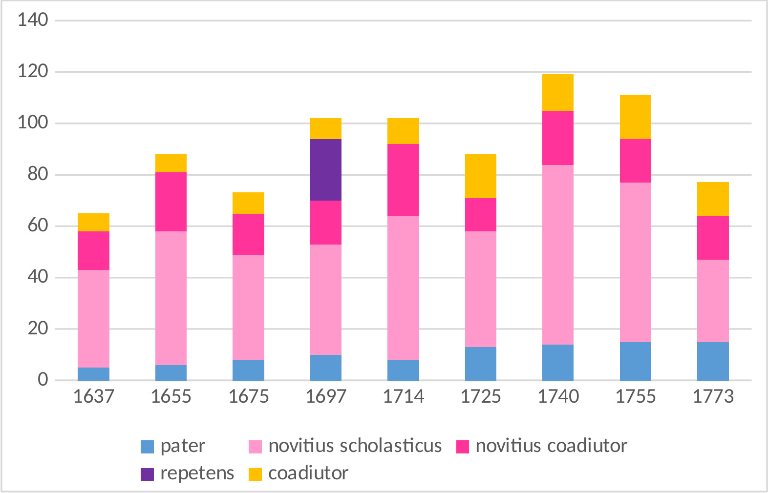 Von den 1690er bis zu den 1750er Jahren lag die Gesamtzahl der Mitglieder im Probehaus regelmäßig zwischen 90 und 120, wobei neben den Novizen bis zu 10 bis 15 Priester und 10 bis 15 „veterane“ Laienbrüder im Noviziat arbeiteten. Zeitweise (1684, 1696–1703) gab es auch Repetitionskurse im Probehaus mit 12–26 Scholastikern. (Siehe unten: Verbundene/Weitere Einrichtungen.)